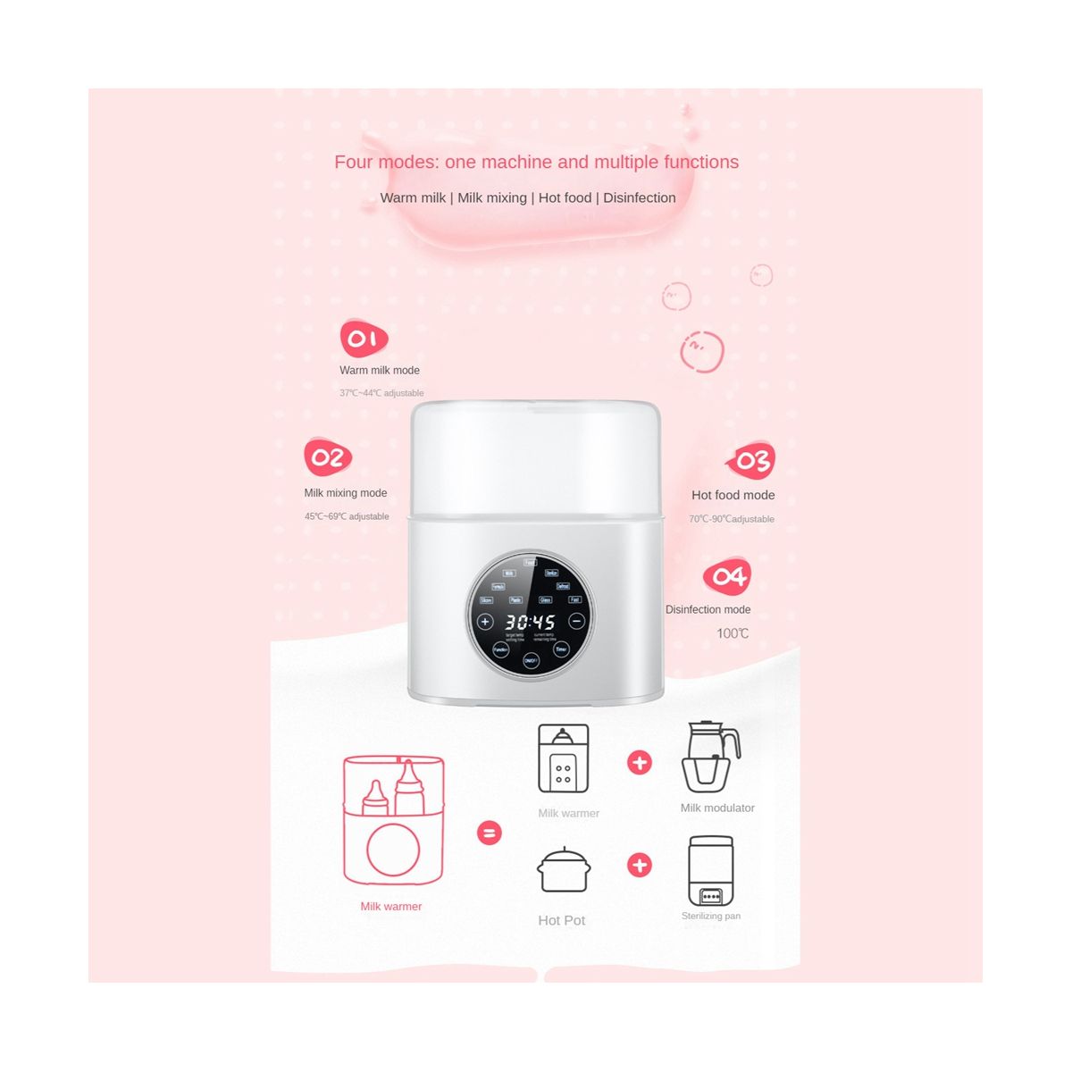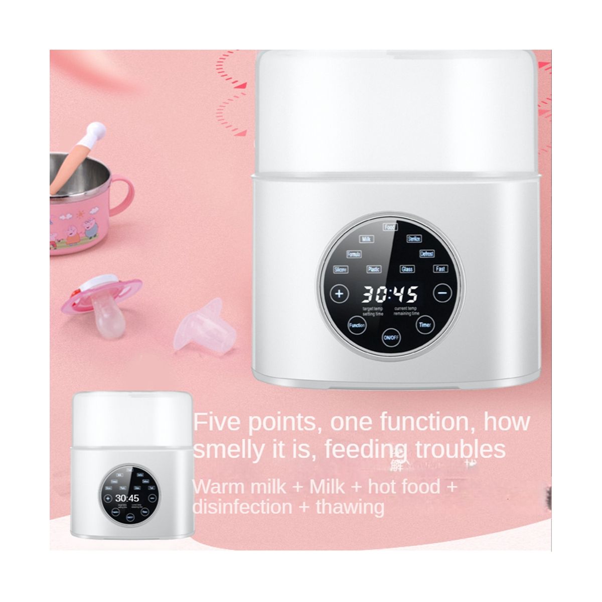 Detailed Information About The Product:[Fast Warming in 3-7Mins]Takes 3-7mins to heat the breastmilk and formula to body temp, the fast milk warmer quickly calms the crying and hungry babies and makes life easier. Built-in sterilization function to clean bottles and nipples with high temp . Beeps when heating or steaming is complete and auto powers off for greater safety and .