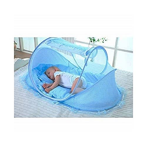- Pop up baby bed is blue with mixed colors.