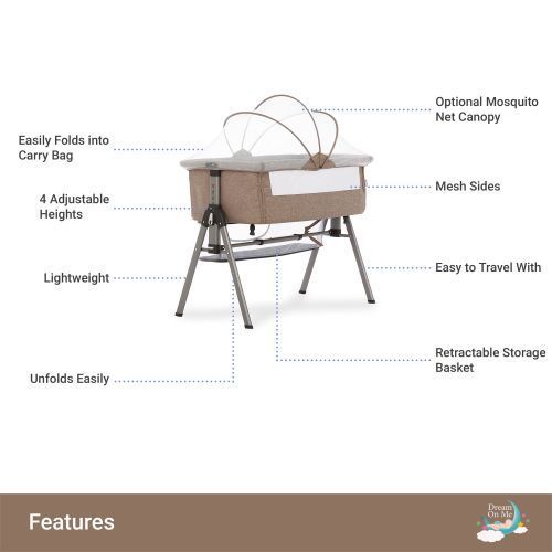 Everything starts with a dream, start yours with the Lotus Bassinet by Dream On Me - the product that lets your baby be close to you throughout the day and night. When used as a standalone bassinet, the Lotus unfolds easily into a cozy oasis which can be moved throughout your home with little effort. The bassinet includes a mesh side for easy view of your baby, an optional mosquito net and a retractable storage basket for necessities. After a brief transformation into a bedside sleeper, the Lotus can be used on an adult-sized bed. Lotus includes 4 adjustable heights to ensure an appropriate fit every time. You will find that the Lotus is as easy to transport as it is to enjoy with its simple setup process and carry bag that will fit any parent's lifestyle. Enjoy the journey, NAPmaste!