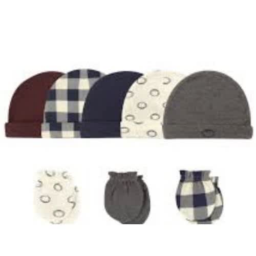 babies 5-pack caps are ideal for everyday use. Made of 100 percent cotton, these caps are soft and gentle on baby's skin, but durable and machine washable for every day use. Perfect for keep baby's head warm and away from the sun. This value 5-pack comes with 2 solid color caps, 1 caps with design on the bottom, and 2 patterned caps that all have coordinating colors and designs for a great matching set.