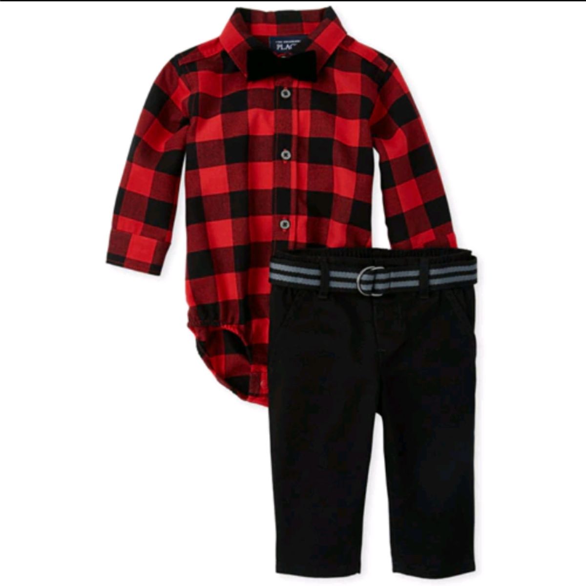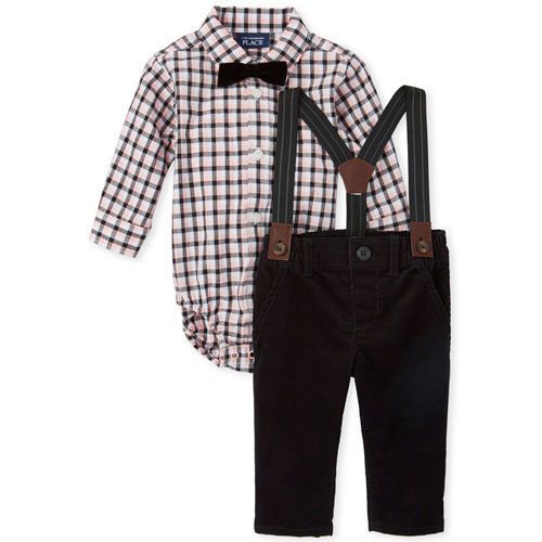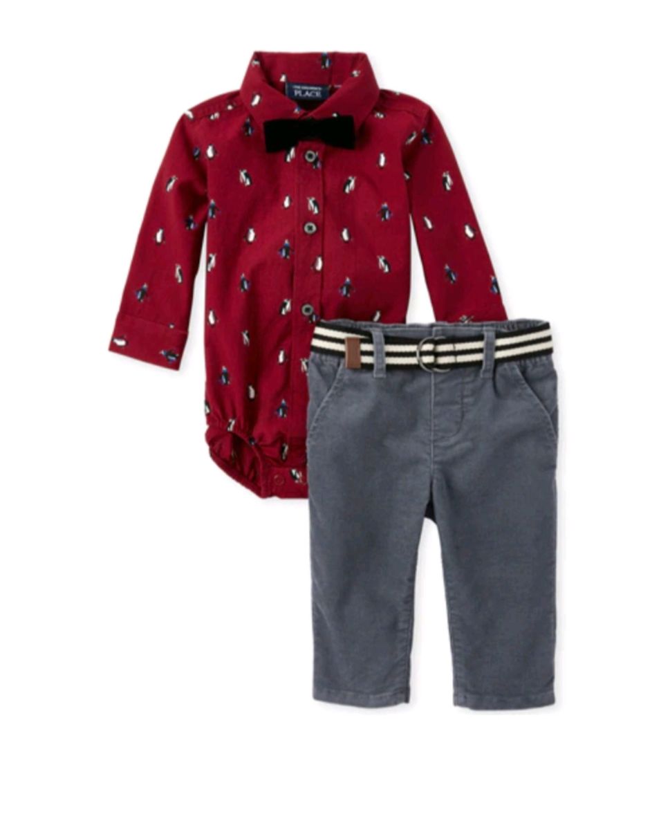 Bodysuit made of 100% cotton poplinAllover dot dice printClassically styled with a pointed collar and buttoned frontSnap closure at bottom for easy changedElasticized leg openingsChino pants made of 100% cotton twillPull-on elasticized waistbandRemovable striped D-ring beltPre-washed for added softness and to reduce shrinkage