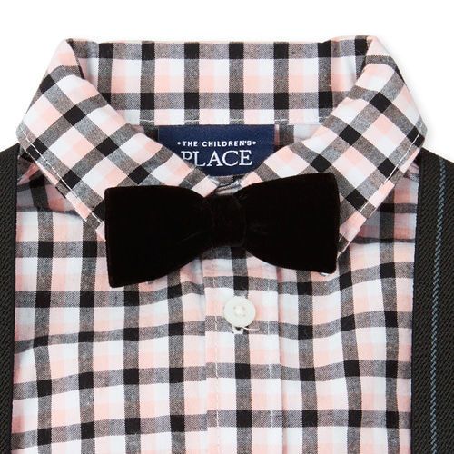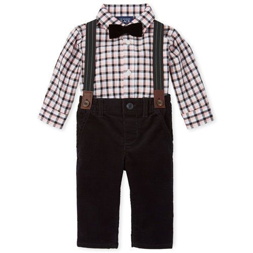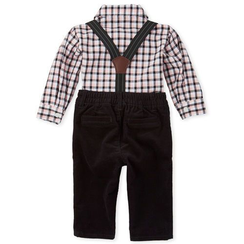 Part of our babyPLACE collectionBodysuit made of 100% cotton poplinAllover plaidClassically styled with a pointed collar and buttoned frontRemovable pre-tied velour bow tie with hook-and-loop closureElasticized leg openingsSnap closures at bottom for easy changingPants made of 69% cotton/29% polyester/2% spandex corduroyPull-on elasticized waistband with snap closure and no-zip flyFaux front and back pocketsButtons at front attach to suspendersElasticized striped suspenders with button-and-loop closurePre-washed for added softness and to reduce shrinkage