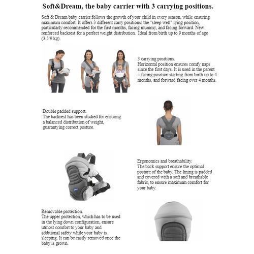 The Chicco Soft and dream carrier is a 3-in-1 infant carrier that lets smaller babies face in towards mom/dad and lets older babies face out to explore! Soft mini-vented lining, adjustable side straps, and mesh side panels work together to deliver a comfortable ride for baby. Padded parent shoulder straps, bi-directional side straps, and lumbar support all adjust to accommodate mom or dad. A unique cuddle pocket helps create an added sense of closeness. Other convenient features include a machine washable snap-on bib, two mesh storage pockets, a covered front pocket, and a matching carry bag.2-in-1: Faces in towards mom/dad or faces out for baby to explore Soft, mini-vented lining, mesh side panels, and adjustable side straps Padded shoulder straps and bi-directional side straps adjust for mom/dadPadded lumbar support adjusts for mom/dad Machine-washable bib, covered pocket, two mesh pockets, and cuddle pocketUsage: For children between 7.5 to 25 lbs.Care and Maintenance:The carrier may be spot cleaned with a damp cloth and mild soap. If needed, hand wash in cold water and mild detergent; air dry. The bib may be machine washed in warm water; tumble dry. Do not use bleach on any part of this product.