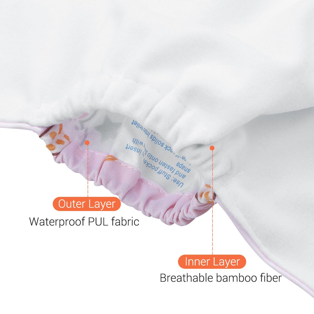 2-layer design, breathable bamboo fiber inner layer, waterproof PUL fabric outer layer.