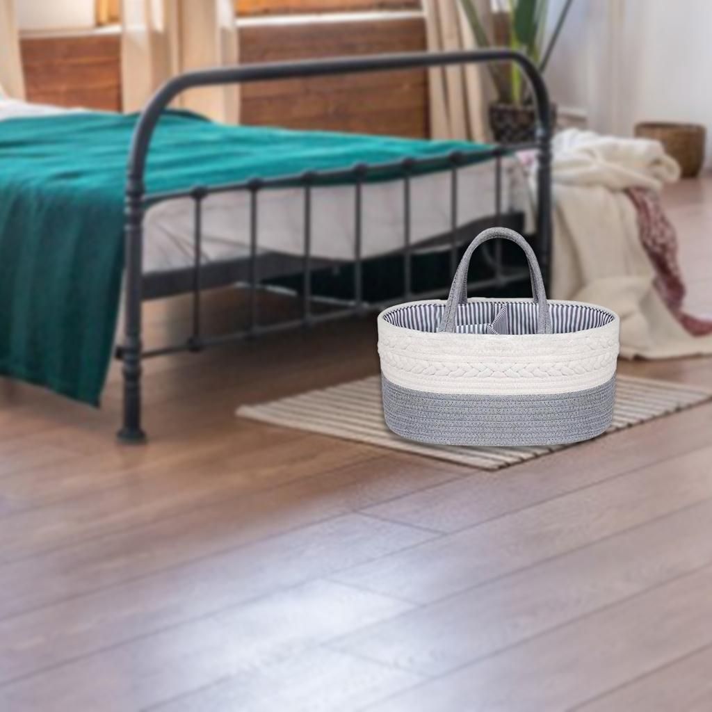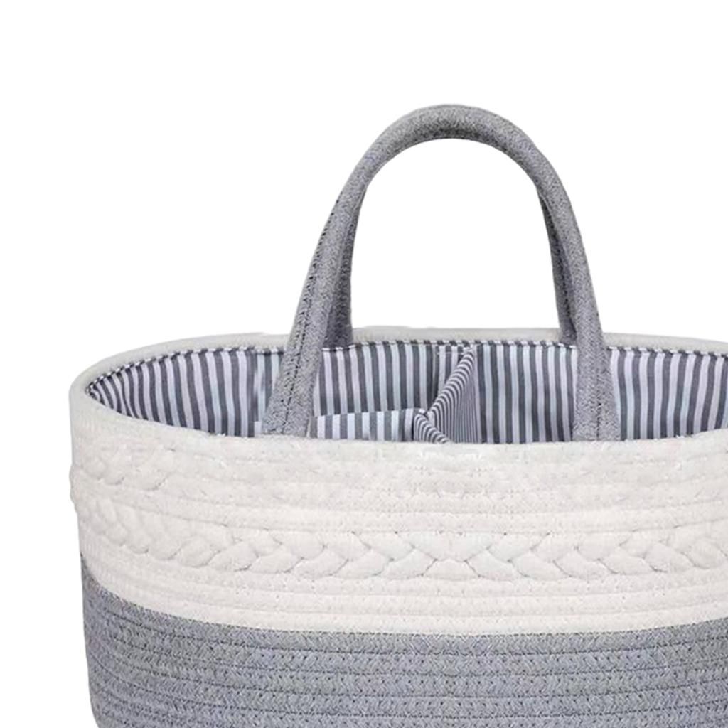 This Baby Diaper Caddy Organizer made of natural cotton ropes with fabric lining- very safety and durable for use 3 removable dividers and efficient layout for organizing and sorting baby stuff neatly Large wide opening provides you instant access to your entire baby stuff while you are in a hurry.Perfect for holding baby toys, diapers, clothes, , bibs, baby toys, changing pads, burp cloths and etc.Carry handles design allows you take it with you to anywhere and very convenient