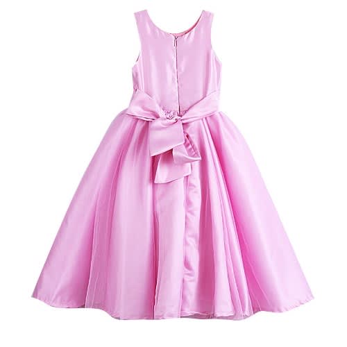 Pastel, 3D floral mesh, sleeveless, bodice and off centered, satin bow to full mesh skirt with tri-color, satin ribbon detail and hem.