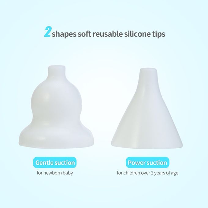 Features:2 SILICONE TIPS - 2 sized tips is made of soft silicone, which can always fit your baby's nose comfortably. 3 suction strength optional, you can switch right strength to suck all the mucus and running nose. Clean baby's nose painless and stress-free.