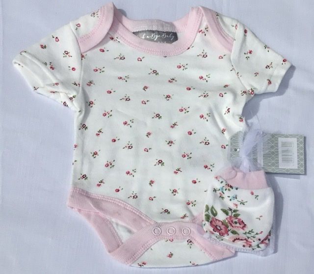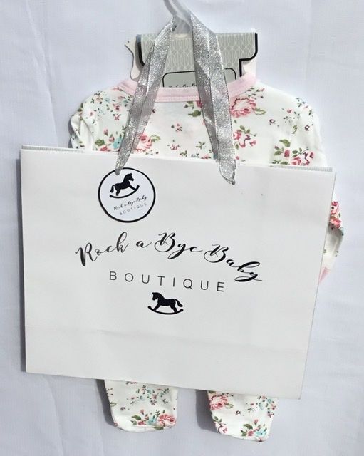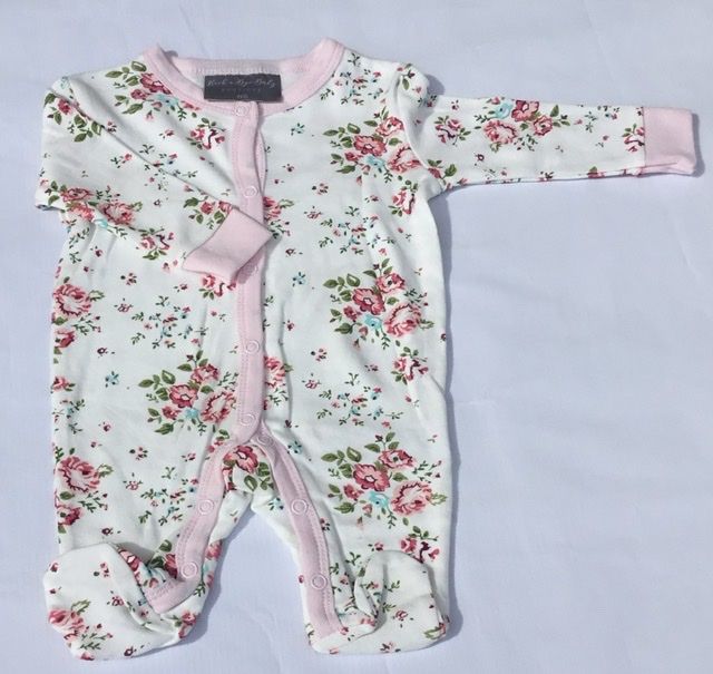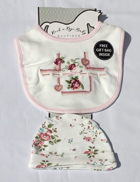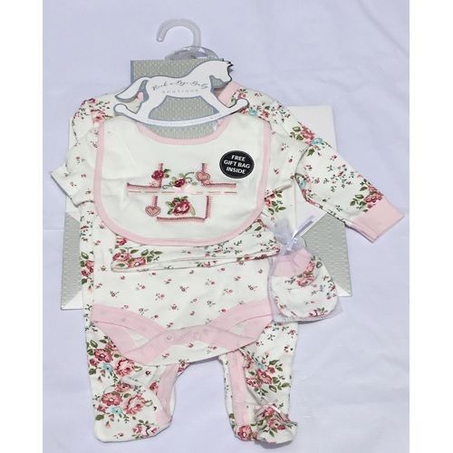 This 5 piece gift set is sure to get some smiles. This set includes everything you need including a sleepsuit, matching cap, a pin-dot mixed with tiny flowers design on the bodysuit, a bib embroidered with flowers, hat and Mitten packaged in a cute mesh bag.
