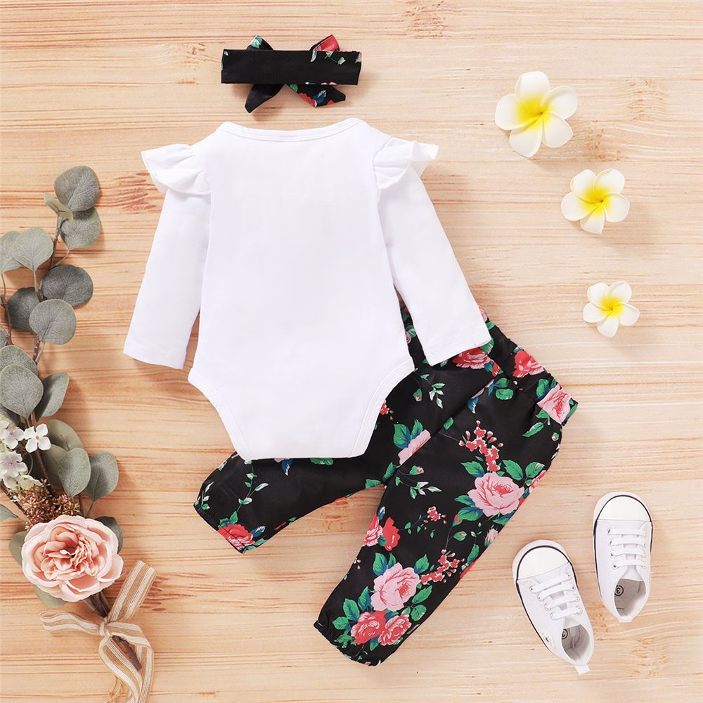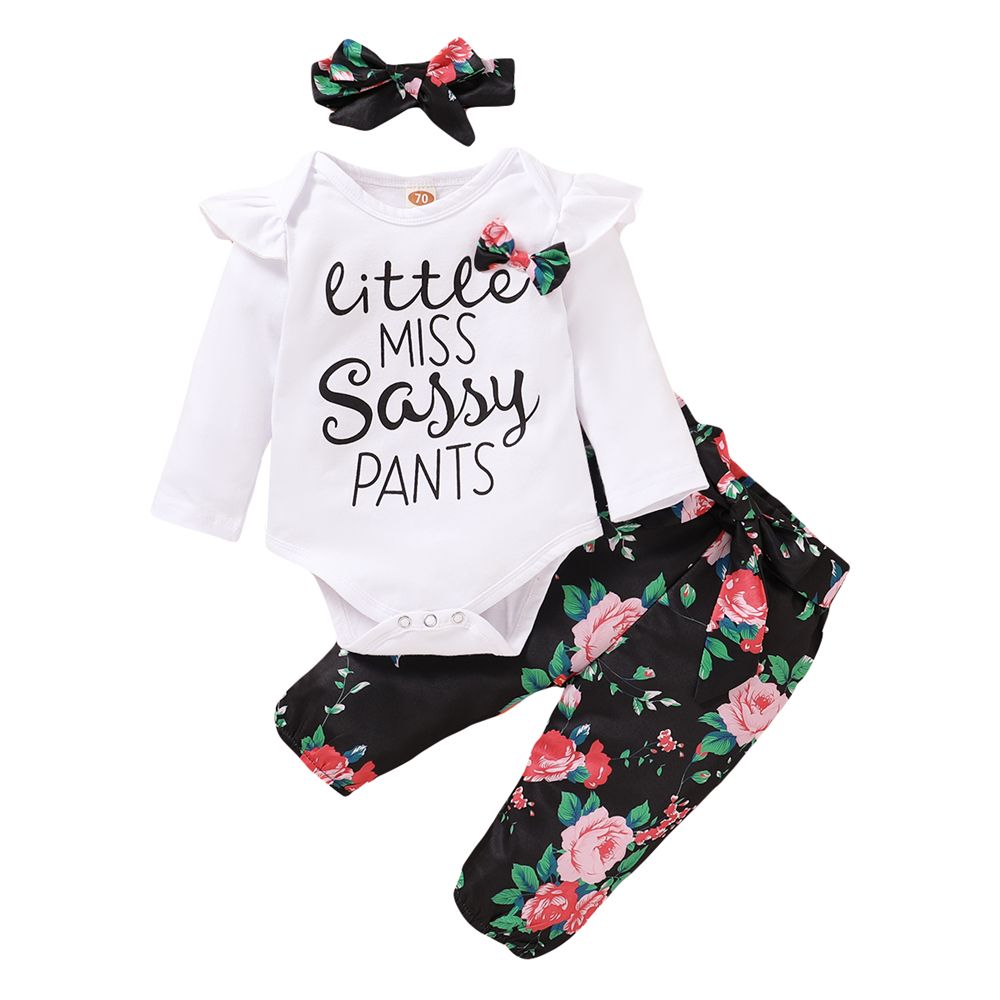 Buy Baby Girls Outfit Letter Print Long Sleeve White Bodysuit + Floral Pants + Headband in Nigeria