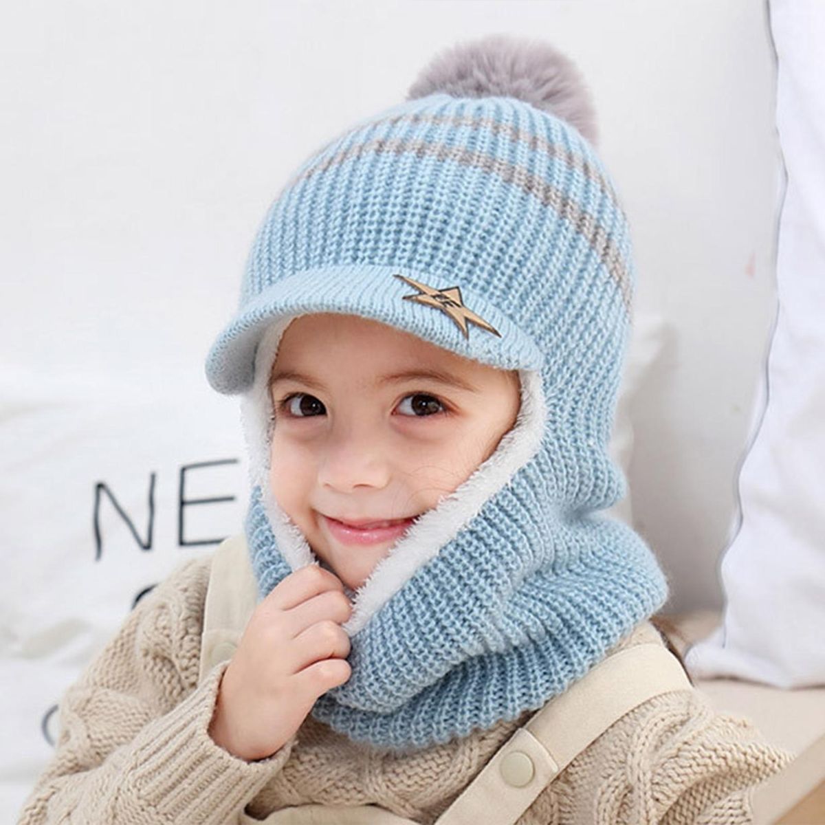 Featured with the big plush ball design, this hat makes the baby look more cute. Because of thickened plush lining, it will be very suitable for wearing in cold weather.