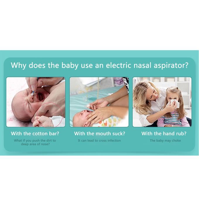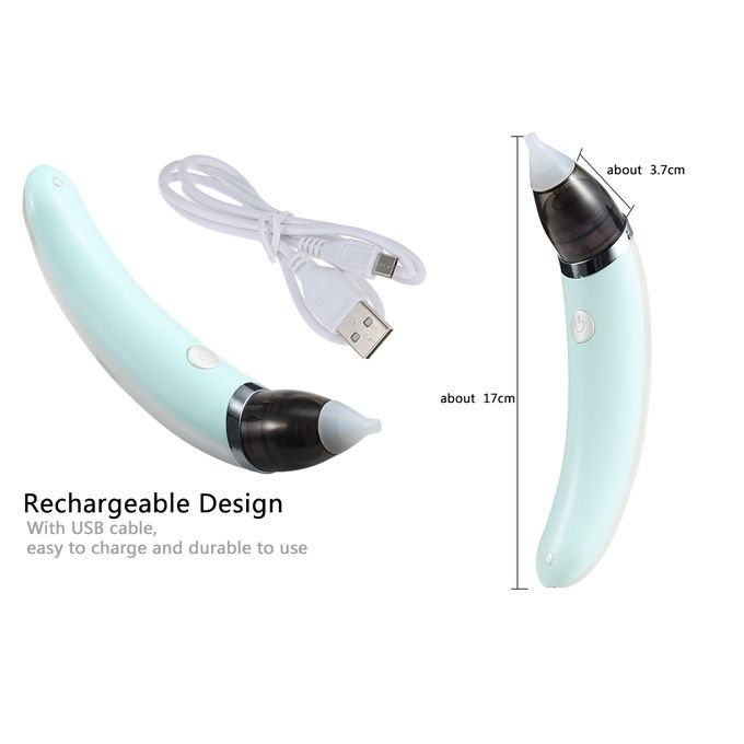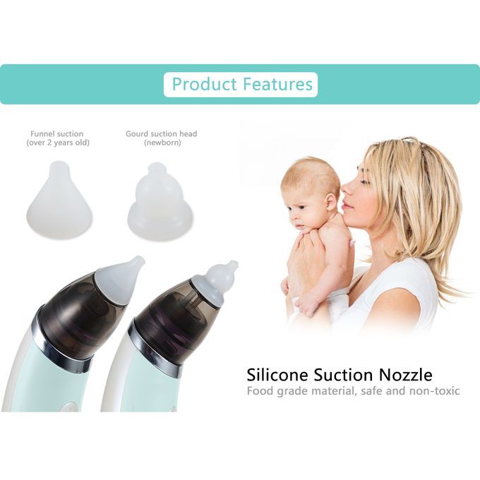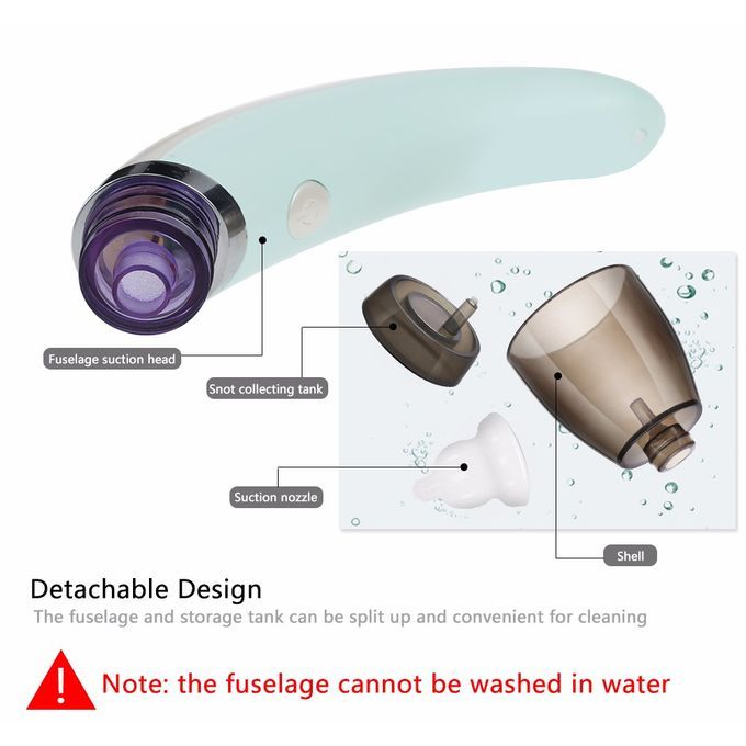 Description:1.Five gears can be adjusted and selected by one key control, easy and convenient for meeting different needs2.Food grade silicone suction head and nozzle, soft and skin-friendly3.Detachable design for cleaning conveniently4.Ergonomic design with humanized radian, comfortable to hold5.Rechargeable design with USB cable, easy to charge and durable to use6.Anti-reflux design, can prevent the snot from flowing back into the nose