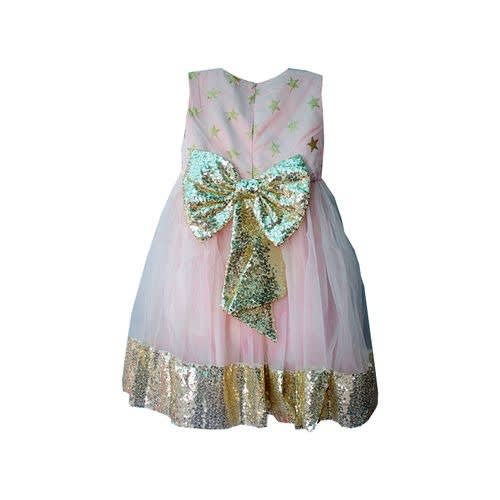 A special ball dress for a baby girl with stars made in gold color at the top of the dress.At t he centre is a big bold gold bow.The gold is made with sequin, At the back is a detachable big bold bow made with gold sequin. The head band is also baby pink decorated with gold sequin.The edge of the outer fabric is trimmed with Gold sequin. This party dress is for celebrants that want to stand out of the crowd.size 80 best for 9-12 mnths ,size 90 idea for 12-18 mnths,size 100 good for 18-24mnths,size 110 just right for 24-30 mnths and 3yrs.