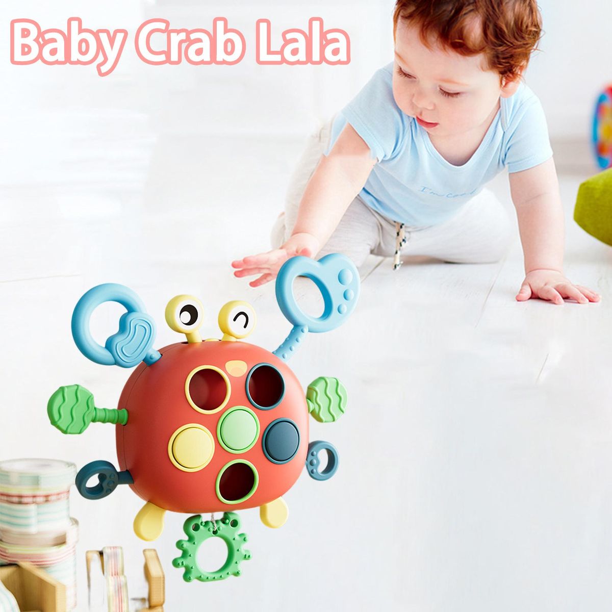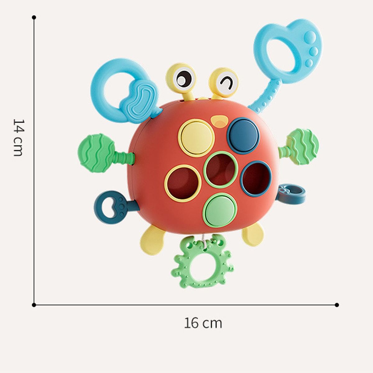 Explores this crab shaped sensory toy through different sounds and vibrations such as pull-up, pull-down, pressing, shaking. It is easier to grasp through soft handle with different textures.