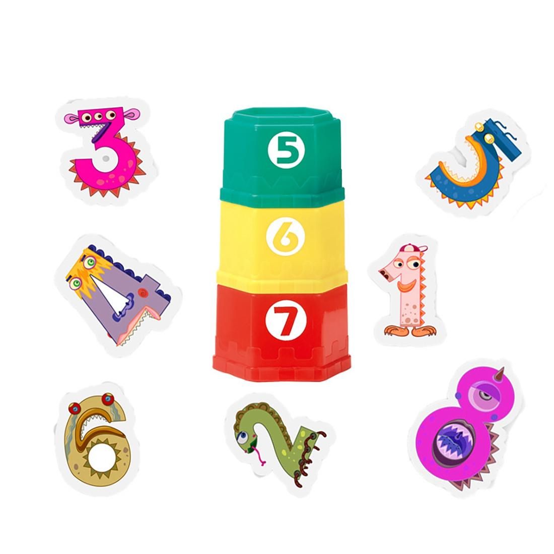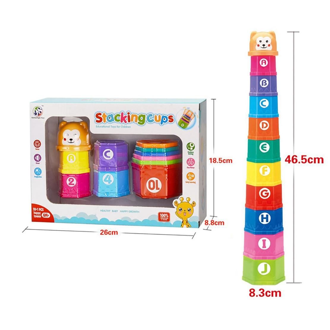 With Number and ABC Characters Comes 10 pieces in a set round shape, Stylish design with different colors matched with different number and aleph bet A B C, help your baby learning the count whilehaving fun in stacking cups.