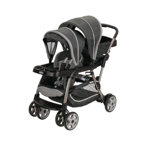 Comfy adventures for two, plus you. The Duo Glider Click Connect Double Stroller has all the essentials a growing family needs. This lightweight double stroller features stadium-style seating, so the child sitting in the rear is slightly raised for a better view. To keep both passengers nice and comfy, both seats feature a reclining seat, child's tray, rotating canopy and footrest. And for Mom, a one-hand fold, extra large storage basket, and parent's tray. The Duo Glider tandem stroller accepts two Graco infant car seats, too. Care and Maintenance: Wash removable seat cushion in cold water on delicate cycle and line dry. To clean stroller frame, use only household soap and warm water. Never use bleach. If wheels squeak, use a light oil. Each seat holds child up to 40 lbs.