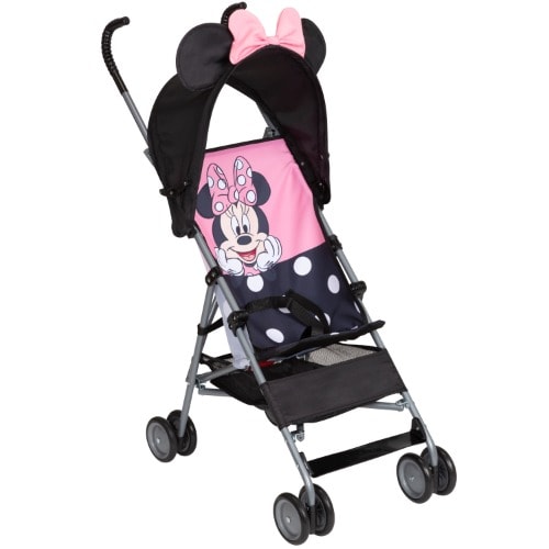 3-point safety harness, Covered handles feature extra height for a more comfortable stroll, Handy storage basket underneath seat, 3D umbrella style fold provides a truly compact fold for easier and more convenient storage, Featuring a fun Disney character, Holds child up to 40 pounds