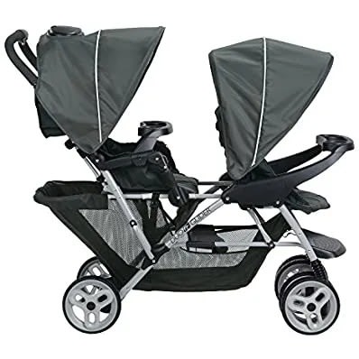 Comfy adventures for two, plus you. The Duo Glider Click Connect Double Stroller has all the essentials a growing family needs. This lightweight double stroller features stadium-style seating, so the child sitting in the rear is slightly raised for a better view. To keep both passengers nice and comfy, both seats feature a reclining seat, child's tray, rotating canopy and footrest. And for Mom, a one-hand fold, extra large storage basket, and parent's tray. The Duo Glider tandem stroller accepts two Graco infant car seats, too. Care and Maintenance: Wash removable seat cushion in cold water on delicate cycle and line dry. To clean stroller frame, use only household soap and warm water. Never use bleach. If wheels squeak, use a light oil. Each seat holds child up to 40 lbs