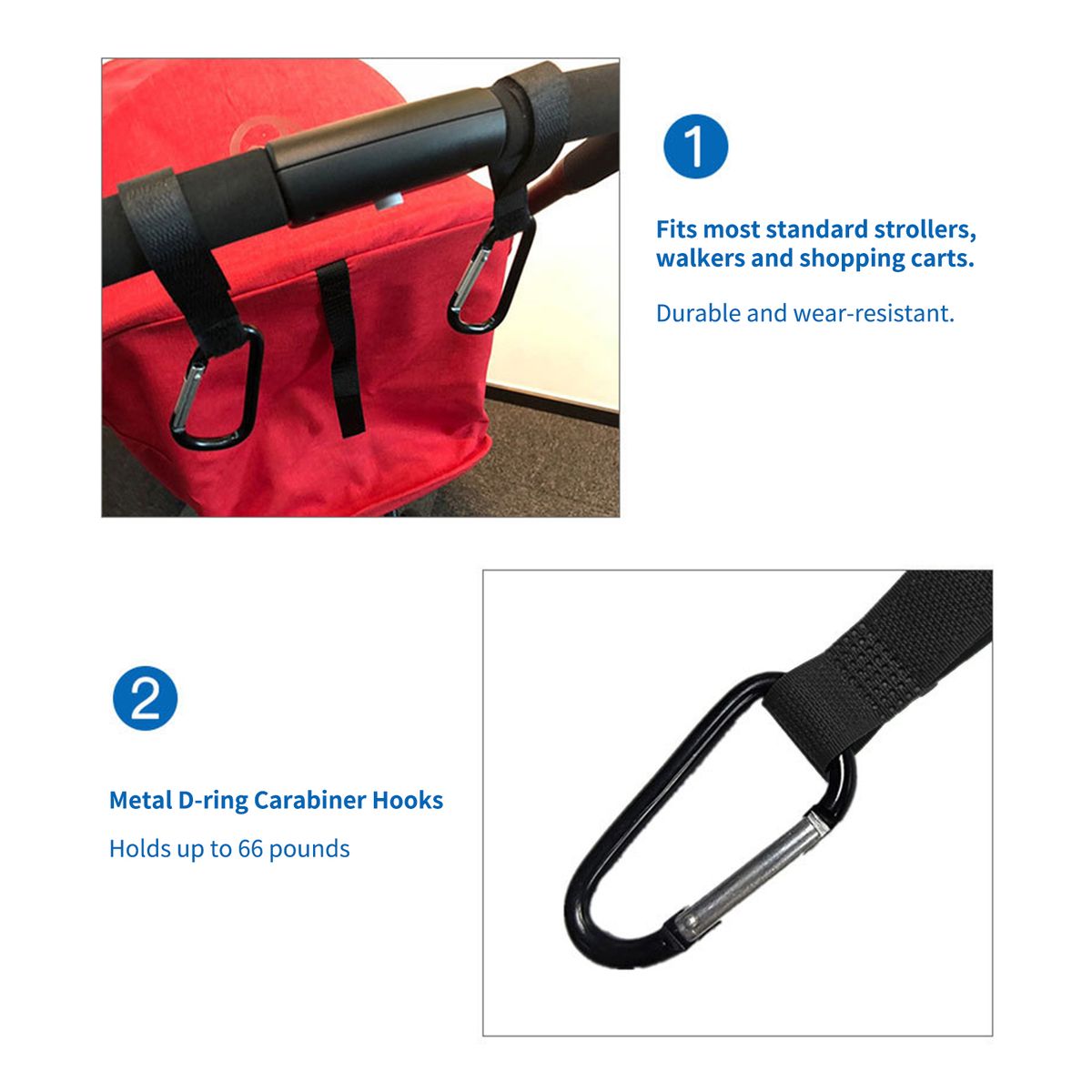 Metal D-ring carabiner hooks, durable in use.