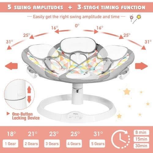 Number Of Items & lrm;1Style & lrm;Portable SwingBatteries required & lrm;YesBattery life & lrm;12 HoursIs portable & lrm;YesItem Weight & lrm;6.69 poundsCountry/Region of origin & lrm;ChinaMaximum weight recommendation & lrm;20 PoundsMaximum number of compatible seats & lrm;1Assembly Required & lrm;YesProduct Dimensions & lrm;22"D x 23.5"W x 23"H