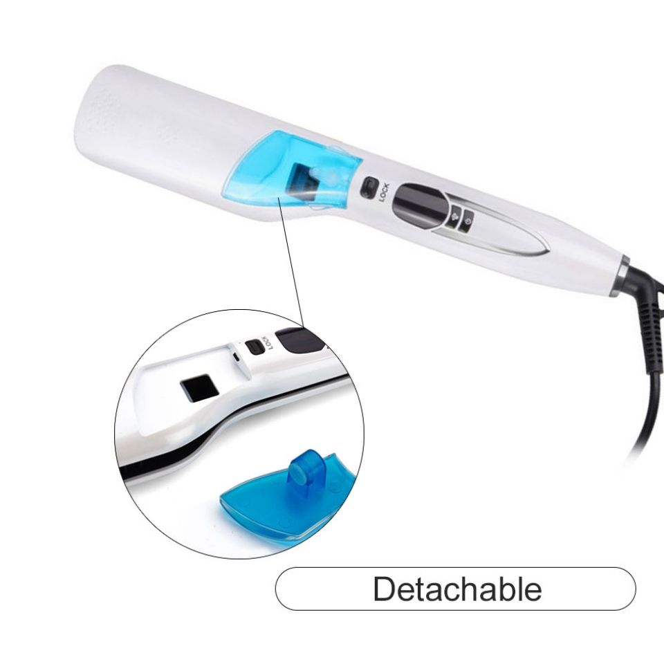 When you open the steam on, there is a bladder protruding inside the splint. When you close the splint, there is a on on the splint and the protruding air bag will transport the water from the water tank to the splint. When the temperature reaches, when you When you straighten or curl your hair, steam will appear.