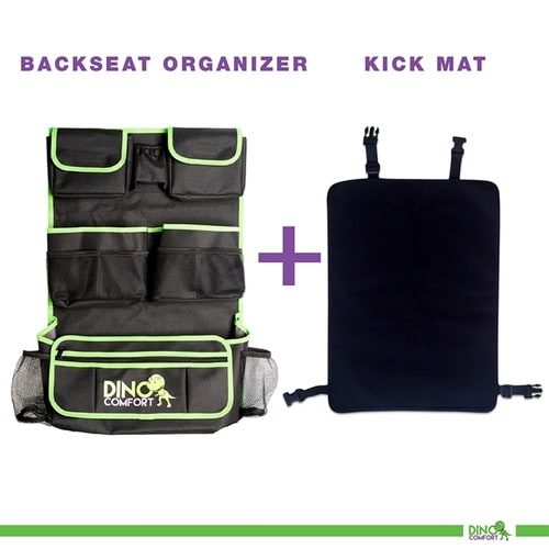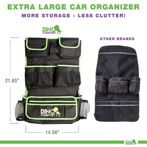 EXTRA LARGE BACKSEAT CAR ORGANIZER- The Dino Comfort car organizer is larger and wider than any other car backseat organizer. It has larger and wider pockets. Even the small pocket of this back seat organizer can store an iPad! Get our FREE gift “Tips for Traveling with Kids” eBook!