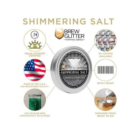 We are excited to introduce our NEW Shimmer Pitch-Black Cocktail Rimming Salt. Our colorful salt is a great way to garnish the rim of your glass adding a color accent to your beverage. Pairs great with Margaritas, Cocktail drinks and more let your imagination create tasty, colorful, and fun drinks for any occasion. Also try our Brew Glitter or Brew Dust to create the masterpiece of your choice!