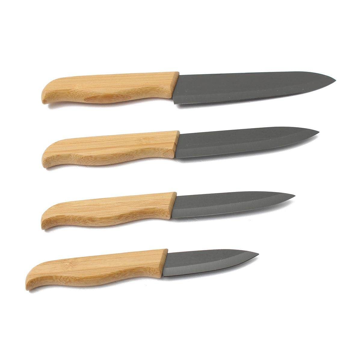 This ceramic set includes four knives of different size, They are made of ceramic and ABS material.
