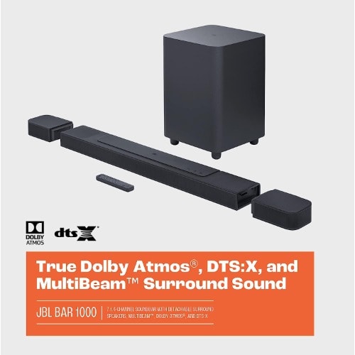 Panoramic 3D surround sound without limitsExperience movies, music and games with sound that puts you right in the middle of theaction, thanks to 880W of total output power and thunderous bass from the 10 & rdquo; subwoofer.The JBL Bar 1000 has MultiBeam & trade; and four up-firing drivers & mdash;two in the bar and two inthe detachable battery-powered surround speakers & mdash;to envelop you in a sphere of DolbyAtmos & reg; and DTS:X 3D surround sound with a wide, spacious soundstage with no need todraw extra cables. You & rsquo;ll never miss a word with our PureVoice technology, which makessure the dialogue is clear even when other sounds are at their loudest. When you & rsquo;re readyfor some music, stream your favorite playlist from AirPlay, Alexa Multi-Room Music (MRM),and Chromecast built-in & trade; and it & rsquo;ll feel like the band is right there. Have a great night outwithout leaving your living room