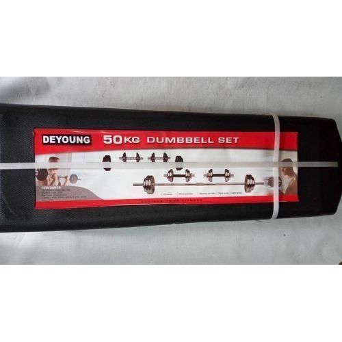 The 50kg black cast iron barbell and dumbbell weight set is a quality choice designed to enhance your strength training, especially focussing on your upper body. However, the equipment can be combined with exercises such as squats, lunges and more to work your whole body, making it a handy addition to your fitness routine. The chrome plated bar and dumbbell bars have knurled handles that improve your grip, letting you work out with confidence, and the weight plates have a durable black finish. The set is made to endure intense training sessions and the 14 cast iron plates allow you to vary the weight you lift, with spinlock collars to secure the plates in position. The 50kg corresponds to the complete weight of the set, which includes the weight plates, bars and the spinlock collars.