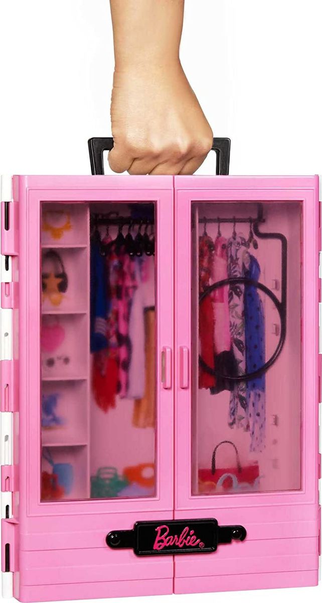 Pack Barbie® doll for a world of possibility! The Barbie® Ultimate Closet™ is designed for portability with a carrying handle. Decorated with BarbieBarbie signature style, the pink closet features translucent doors for a peek into the wardrobe. Six included hangars help keep fashions fashionable, and lots of shelf space is perfect for the amazing accessories. A fold-out rack helps role-play dress-up fun. The easy carrying handle keeps the portable closet ready to travel, anywhere, for any occasion, because when a girl plays with Barbie®, she imagines everything she can become! Includes portable closet and six hangers; doll not included. Colors and decorations may vary.