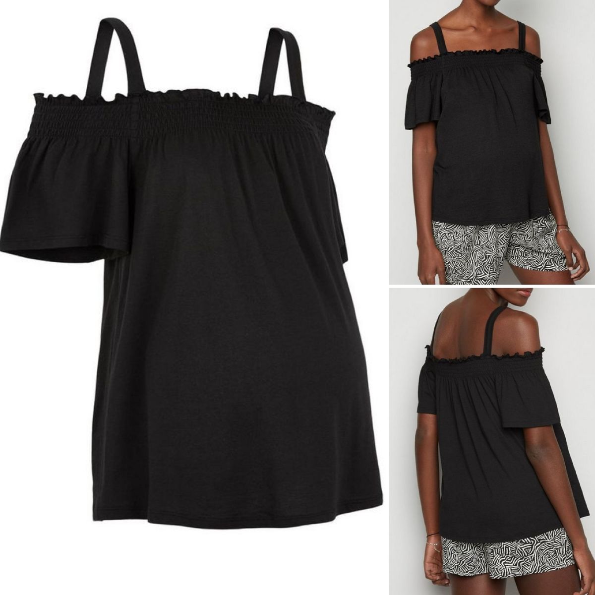 Your maternity wardrobe will be filled with stylish possibilities once you add this black bardot neckline spagetti