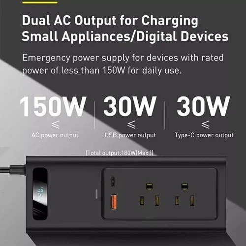 1. Dual AC interface output2.150W high power3. Intelligent digital display current/voltage4. Support fast charging of mobile devices5. Power control protection6.12V model common