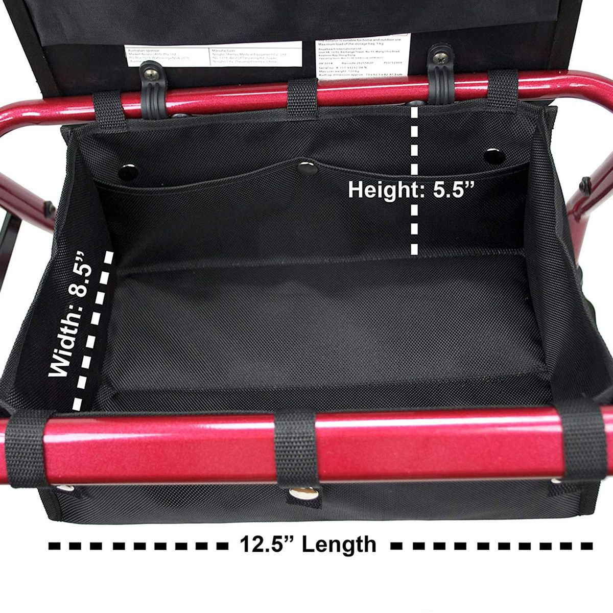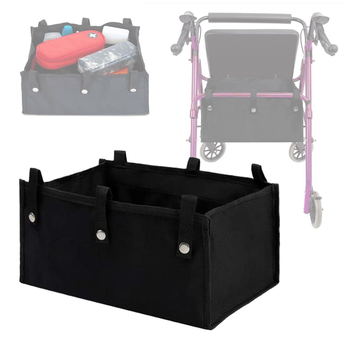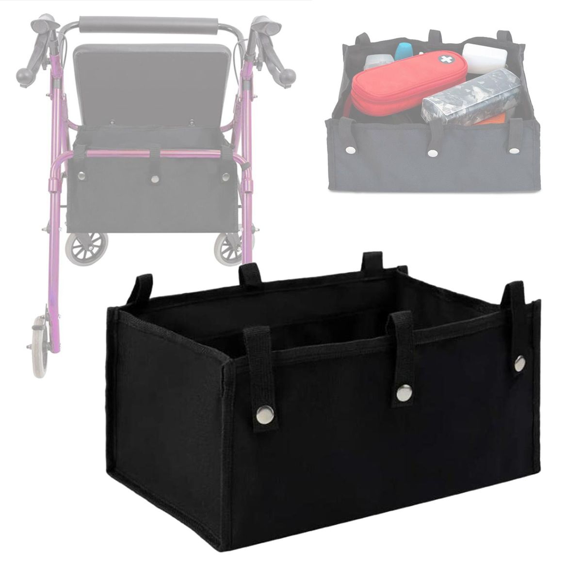Material: Made of high quality 1680D oxford cloth, with quality snaps, you can use it for a long time.Size: Large size - 32x22x14cm/12.6x8.7x5.5inch, perfect for most rollator, helping you storaging and moving the smaller items.Installation: Attached to under the walker by six straps with metal snap, easy to install and remove.Multi-pockets: 4 internal pockets to hold small item like wallet, phone, , bottles, and ect. Convenient: no need to remove it when you fold the rollator.