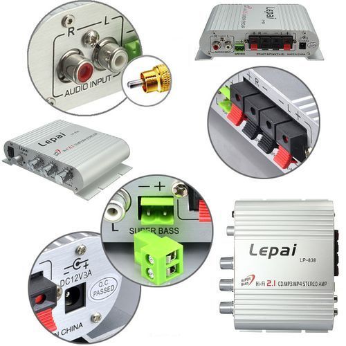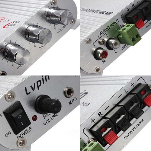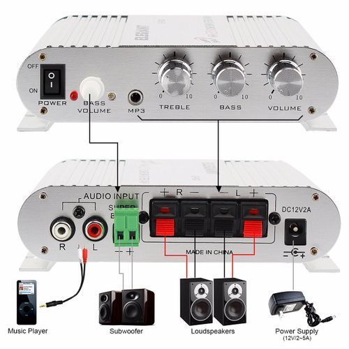 Features: 1.MP3, iPod, CD player input jack 2.200W max power output 3.Low distortion 4.Great for use on your vehicle or your home 5.Smart, lightweight aluminium casing 6.Lightweight, has a matt silver casing and allows for full control of your volume, treble and bass output. 7.It also has a jack for plugging your MP3, MP4, iPod or CD player