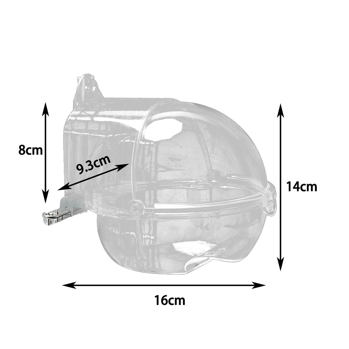 The diameter of this bird bath is 16cm, the total height is 14cm, the length of the pole is 8cm, the length of the entrance is 9.3cm and the height is 8cm.