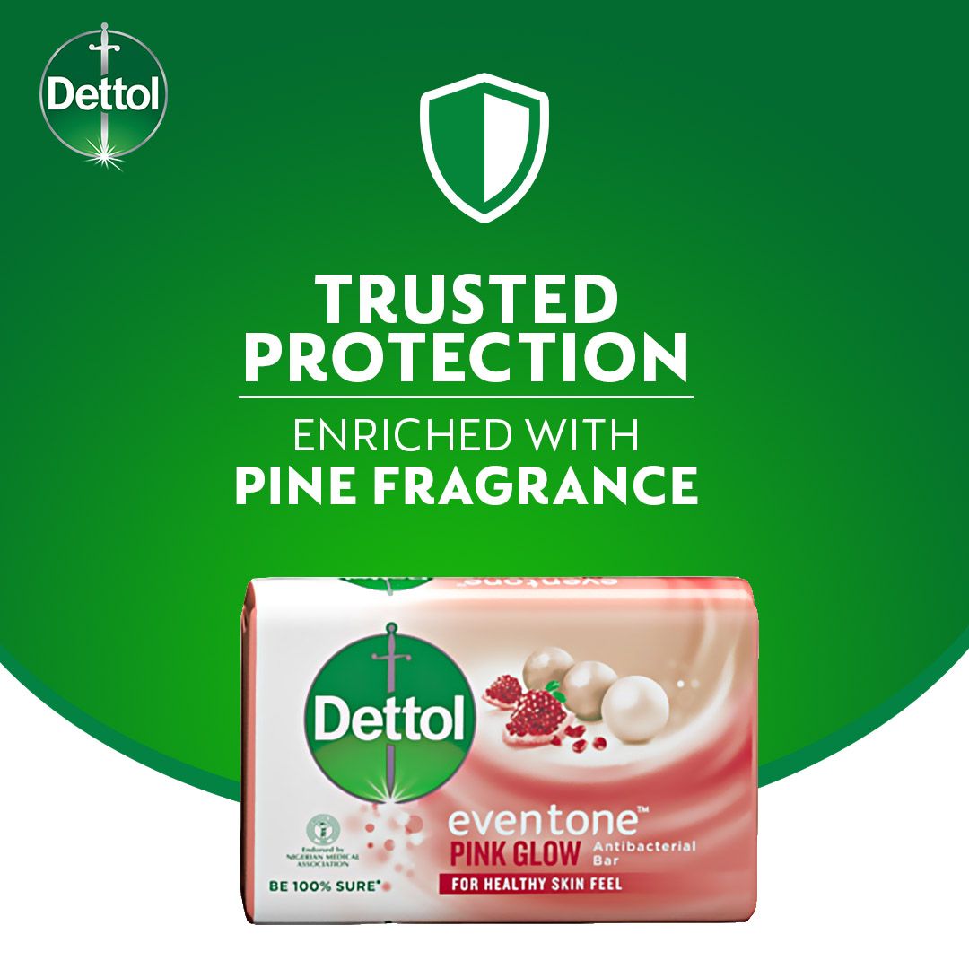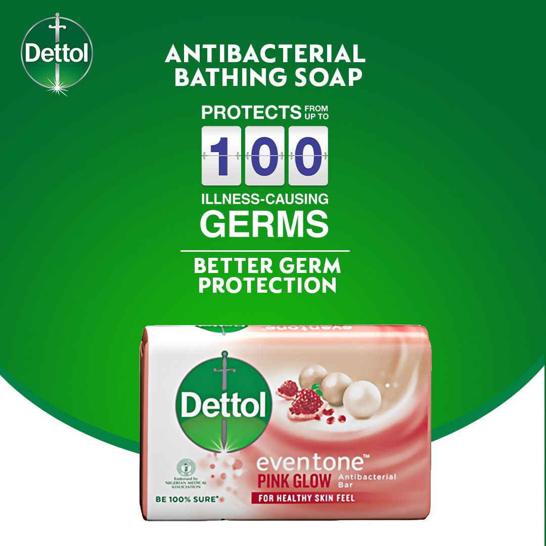 Dettol Even tone Pink Glow bar has a fresh fragrance with crushed apricot seeds and Dettol trusted protection against germs. It helps cleanse your skin cells, leaving you with the confidence of healthy and evenly toned skin.
