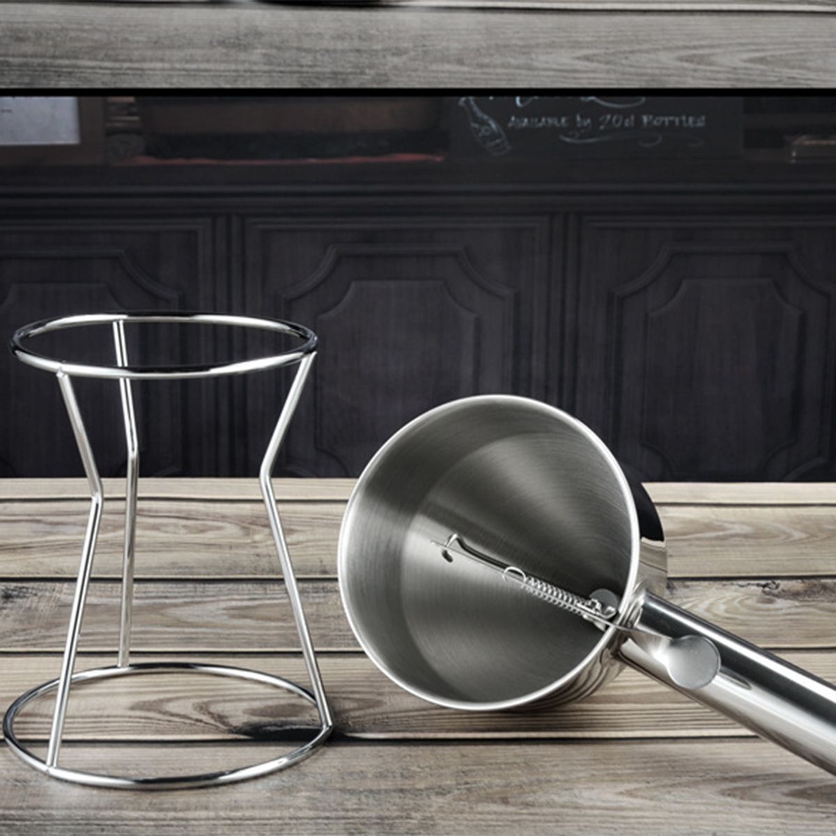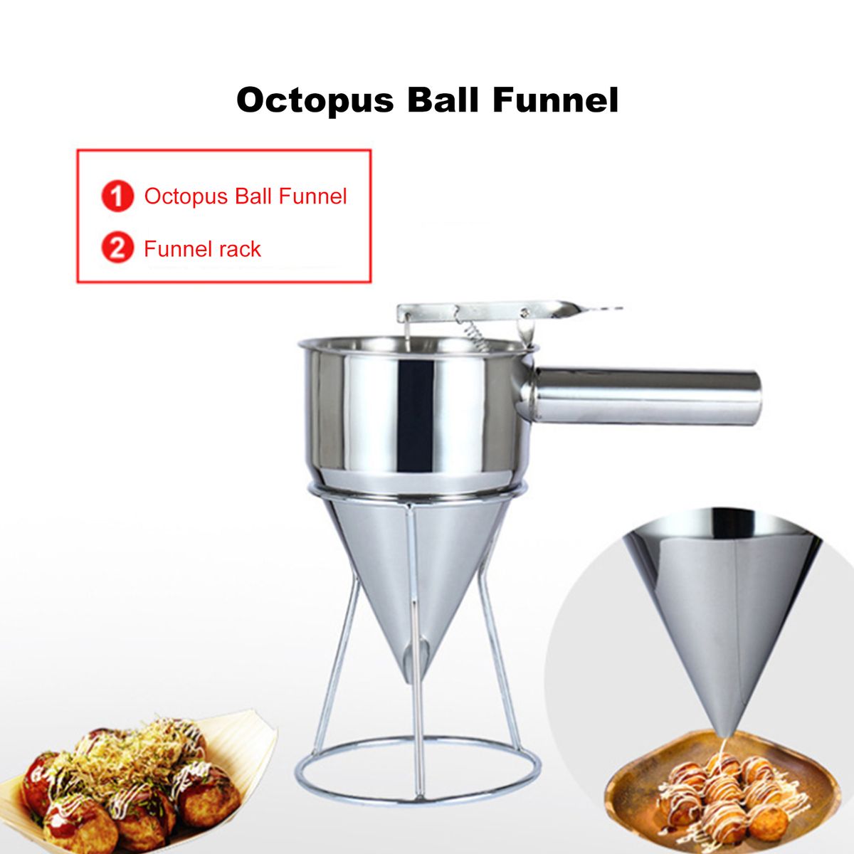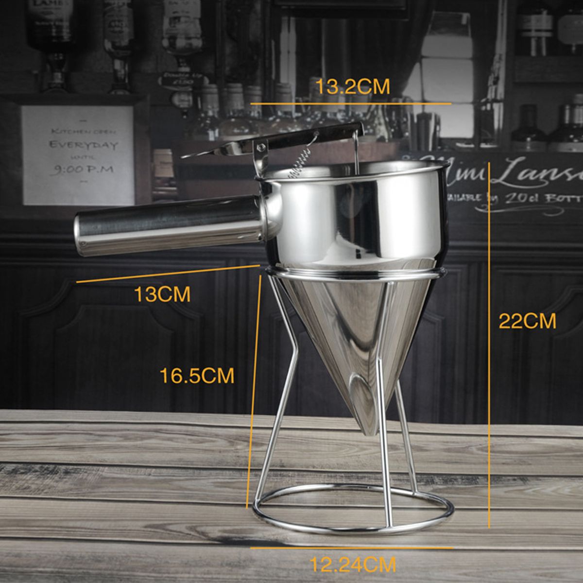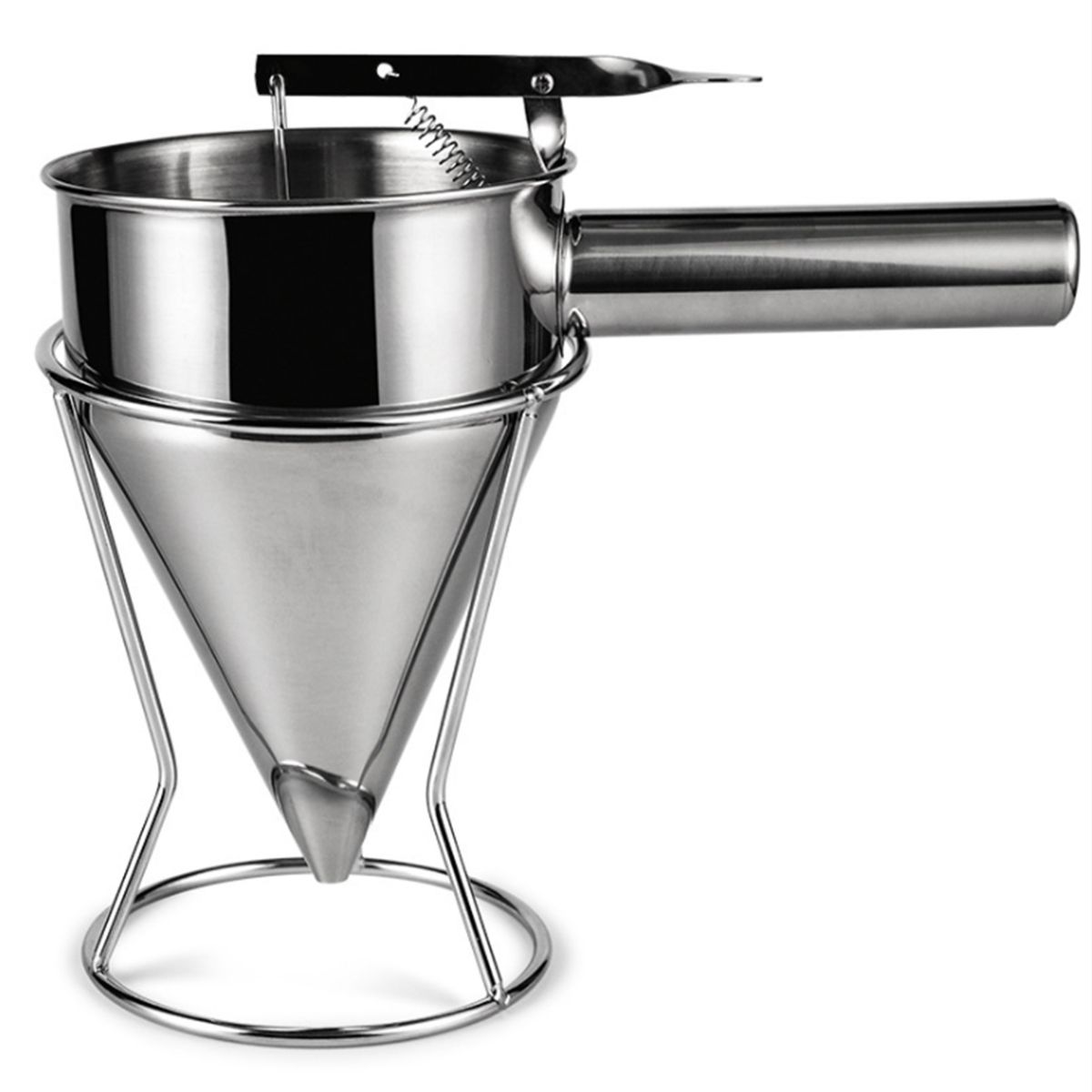Wtih rack: The batter funnel comes with a stainless steel rack designed with a large round base that is very sturdy and allows you to keep the batter cake dispenser there to keep your kitchen tidy when the funnel is not in use.