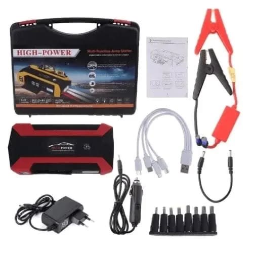 The High Power Multi-function Car Jump Starter With Tyre Inflator handles emergency with ease. It completely eliminates stress that comes with sudden car battery failure, flat tyre or urgent need to recharge like phones and other compactable gadgets without electricity supply.multi-functional emergency kit contains Car Jump Starter, Artificial Current pack, Car Tyre Pump (air compressor), etc. It uses high-current battery that supports fast charging, low self-discharge, up to 3,000 charging cycles. Strong enough to jump start your car approx. 30 times when fully charged. Also comes with 5 additional new features including emergency hammer and safety knife.Jump start your vehicle (up to 5L gas)Tyre air compressor bundled with 2 nozzles, Fast inflation on Tires and much more!High-current battery pack that supports fast charging, low self-discharge.Charging cycle in excess of 3,000 timesVariety of adapters for charging various gadgets including mobile phones , Car and other compatible appliances.3 mode LED emergency light (red, blue and white).In-built surge protection.Easy to read pressure gauge.Dual USB charging port for simultaneous charging of 2 gadgetsBattery can be charged using a wall charger or a car chargerEmergency HammerSafety knifeDuring charging, LED lights indicate battery usage status, one light indicates 20% balance, two lights indicate 40% balance and so on. The built-in battery is empty when all LED lights start to flash.