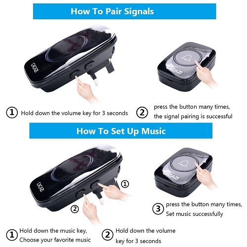 Press the music key to choose your favorite song,hold down the volume button for about 5 seconds, the LED lights on, release the volume button and press the transmitter button immediately.