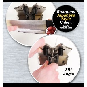 This Diamond Hone Knife Sharpener is a perfect manual sharpener for those who own Asian and European/American style knives and want to quickly and easily apply a superior, shaving sharp edge. Sleek and highly-styled, it's our fastest manual sharpener yet for applying 15 degree edges for Asian style knives and 20 degree edges for European/American style knives. Using precise angle guides, 100-percent diamond abrasive wheels and our acclaimed Crisscross sharpening technology, it provides a super sharp, durable, arch shaped edge with lots of "bite." The secret is in the 100-percent diamond abrasive wheels which sharpen simultaneously "into" and "out-of" the edge for a superior burr-free edge that cuts effortlessly. Separate honing stage polishes the edge for flawless performance. The sharpens all quality knives including straight edge household and kitchen knives, Santoku, sports and pocket knives, as well as serrated knives.