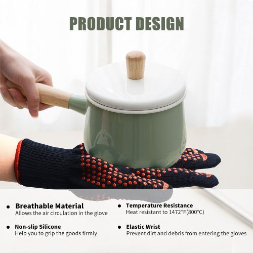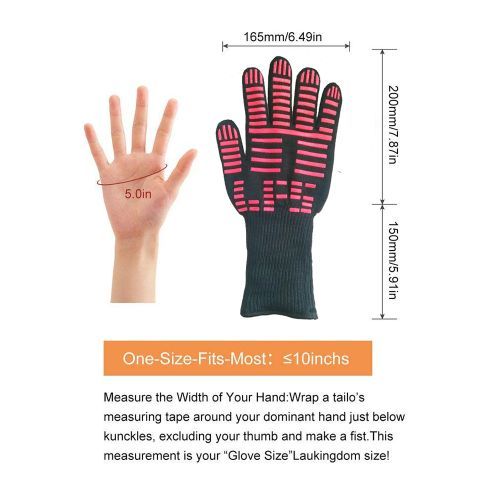 Features:[Temperature Resistance]The BBQ gloves are crafted with high strength material which is heat resistant and heavy-duty known for its ability to repeated use, can withstand 1472℉(800℃).