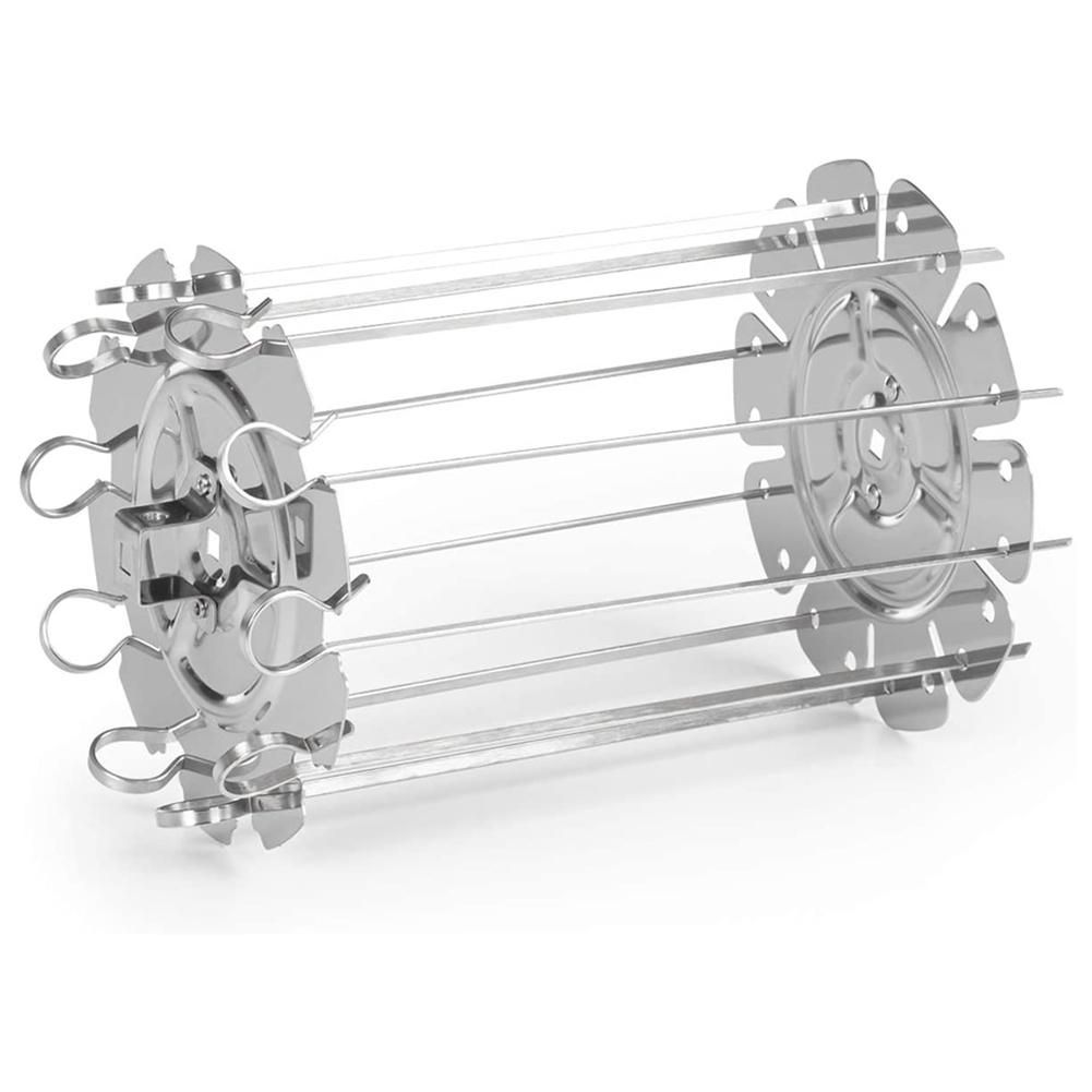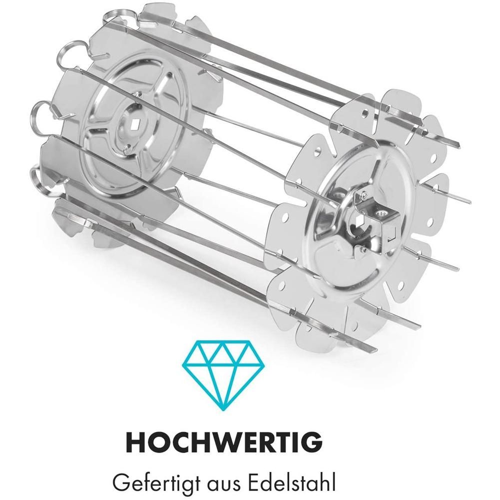 The rotator can be easily inserted into the rotation mount, in which the chicken skewer or the steak cage is otherwise attached. Up to 10 skewers can be prepared at the same time, so that up to four people can be properly cooked. The spit grate is made entirely of stainless steel and is therefore not only extremely durable, but also easy to clean.
