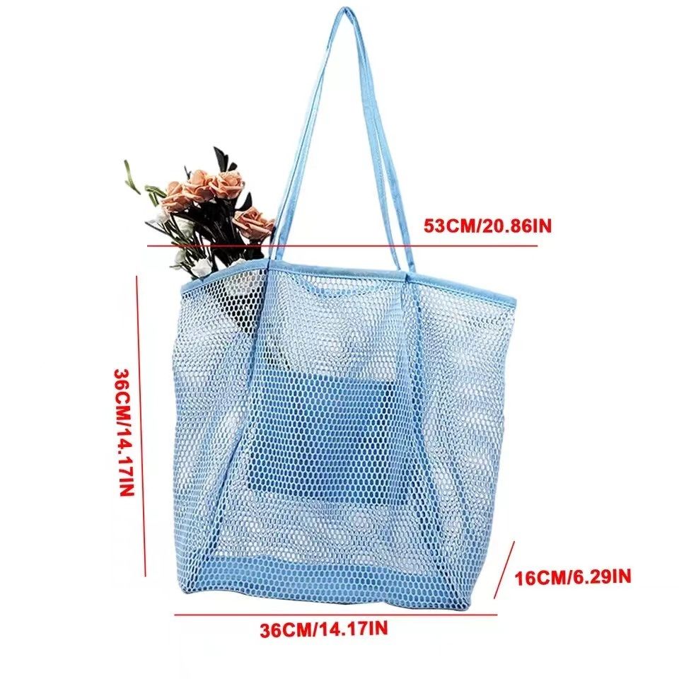 Beach Mesh Bag adopt mesh design ,filters sand and water, dries quickly when wet, has many pockets,quickly finds items, and organizes then separately, Large Mesh Beach Bag can hold evrything you need for a day at the beach/pool. Holds all the towels. swimming gear, beach toys water shoes,water bottle,sunscreen.goggles, and there's even room to spare!