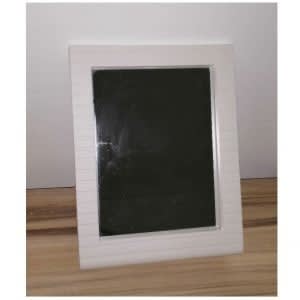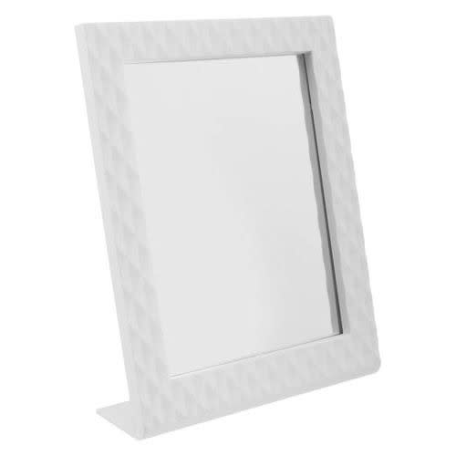 The mirror frame has a base for easy placement of cosmetic items.