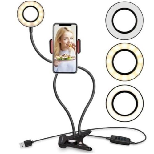 Sturdy & Stable--stylish ring light adopts durable aluminium alloy rod for better support, uses round base & anti-slip silicone pads to stably stand on tabletop, not easily wobble.Dimmable--3 light colors(white/natural/warm) & 10 brightness levels adjustable allows one light to meet demand of different uses, such as portrait photography, live streaming, video recording, etc.Foldable & Adjustable--it can be extended up to 58cm high, also folded up into portable size, space-saving and lightweight to carry around; phone holder with 360 & deg; rotatable ball head enables easy angle adjustment.Convenient--this circle lamp works as fill light, also make-up mirror; extra store space in the base is designed to keep and organize power cable or other small objects.USB Powered--the light is powered via a USB cable with controller on it, which makes it work with laptop, PC, power bank, etc.Specifications:Material: Aluminium AlloyColor: Black, Pink, WhiteLight Source: 64pcs LED beadsColor Temperature: 3200~6000KLight Mode: 3(white/natural/warm)Brightness: 10 levels