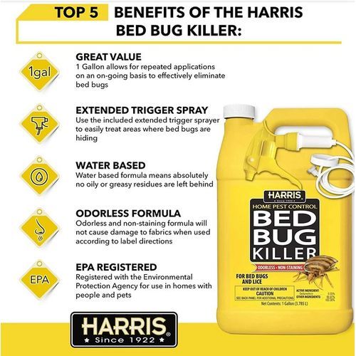 Harris Home Pest Control Bed Bug Killer uses an odorless formula. Approved for indoor use in apartments and residences. Additionally, it features an extended trigger sprayer for easy application. The gallon is an excellent value, allowing for repeated applications on an ongoing basis to effectively eliminate bed bugs. The spray is great to use in combination with a bed bug fogger, bed bug traps, bed bug interceptors, bed bug powder, bed bug bo mbs and bed bug mattress encasement covers to eliminate these bugs from your home.