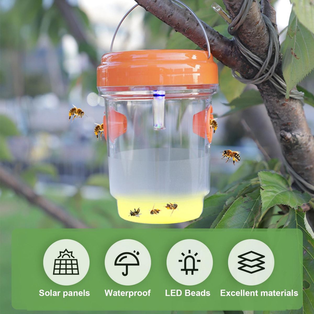 Waspemit a violet light outdoors to attract wasps, thus enhancing the attractiveness of the wasp trap. The wasp trap has two specially designed trapping channels on it, large on the outside and small on the inside, so that when wasps enter the wasp trap they cannot escape.