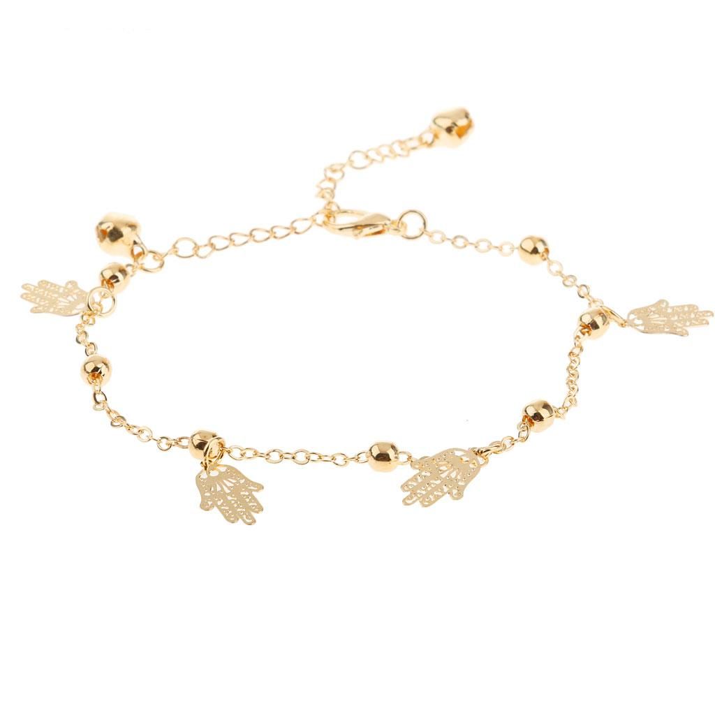 ntroducing Anklet with Chain with bell hand of Fatima design Jewelry for party wedding and other ocasion. This fashion product is made of Golden alloy metal for your outdoor party, beach party and any other party.