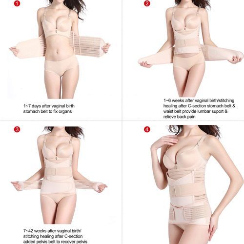 Usage:Stomach belt: Shrinks belly and abdonimals half way back to normal. Recommended for 1-7 days after birth or c-section.Waist belt: Flattens the entire midsections. Relieves back pain. Recommended for 1-6 weeks after birth or c-section. belt: Speeds up contractions, reboots and restores optimal muscle and organ function. Recommended for 7-42 weeks after birth or c-section.