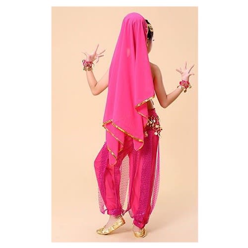 This new belly Indian dance costume is made up of 7 pieces. They are a trouser, a waist band with gold medal sequin.Trouser is free size with elastic waist band to fit the body.A Top with heavy gold sequin , a scarf to cover the back side, 2 hand bands with gold sequin and a gold plated metal head band with a red stud.100- is suitable 5-6 years, 110 is for 6-7 yrs, 120 for 7-8 yrs, 130 for age 8-9, 140 just right for 9-10 years and 150 for 10-11 years.. Size 160 is for 11-12 years.Fabric is easily washable and maintained.